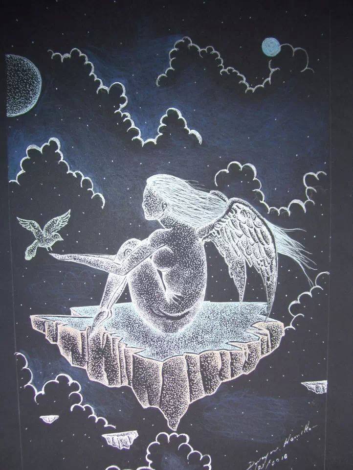 Birds, female figure, and rose are common elements in his work. His work is worth collecting while he is young in his expressions.His unique concepts makes him stand out and he only needs now to strive to develop his techniques to be as dramatic as his concepts so catering to a wider variety of clients.